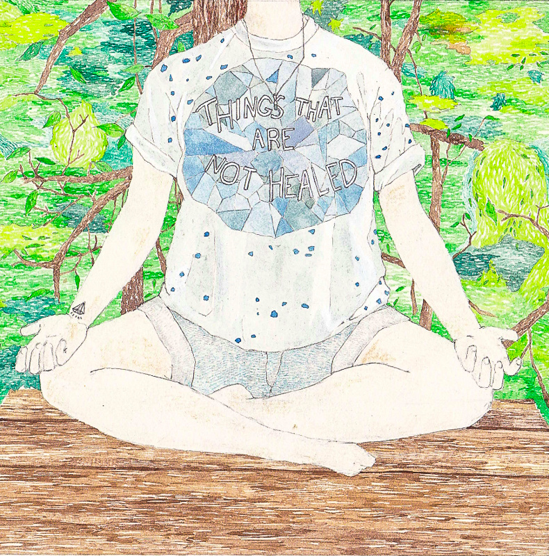 Alanna has a drawing which says, “It hurts not to be open... open wider.” And in the middle of the drawing are some of those blue triangles I was talking about earlier. And in the middle of the blue triangles there is a space, and in the middle of the space are the words, “heart attack”. All of the drawing is blue, not just the triangles.